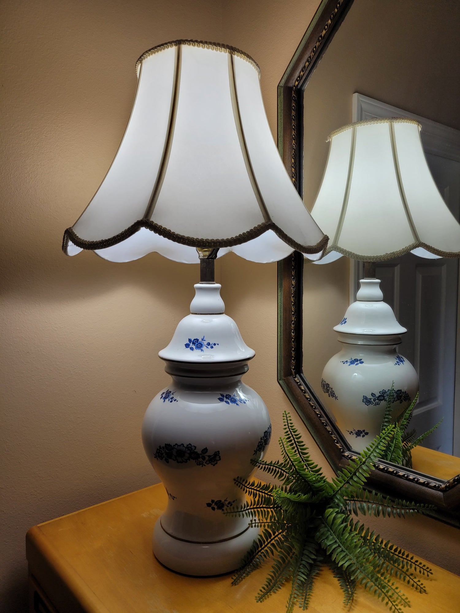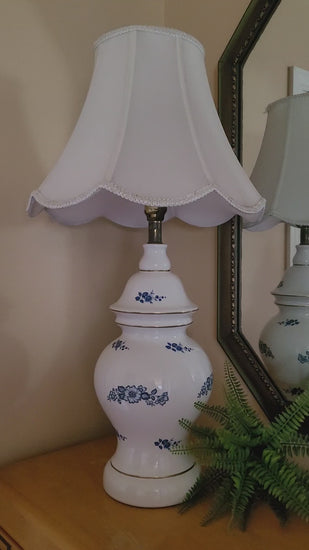 Lovely vintage porcelain lamp with blue and white floral details. Scalloped shade included. Lamp measures 6½" w x 30" h. Shade measures 15" w x 11" h.