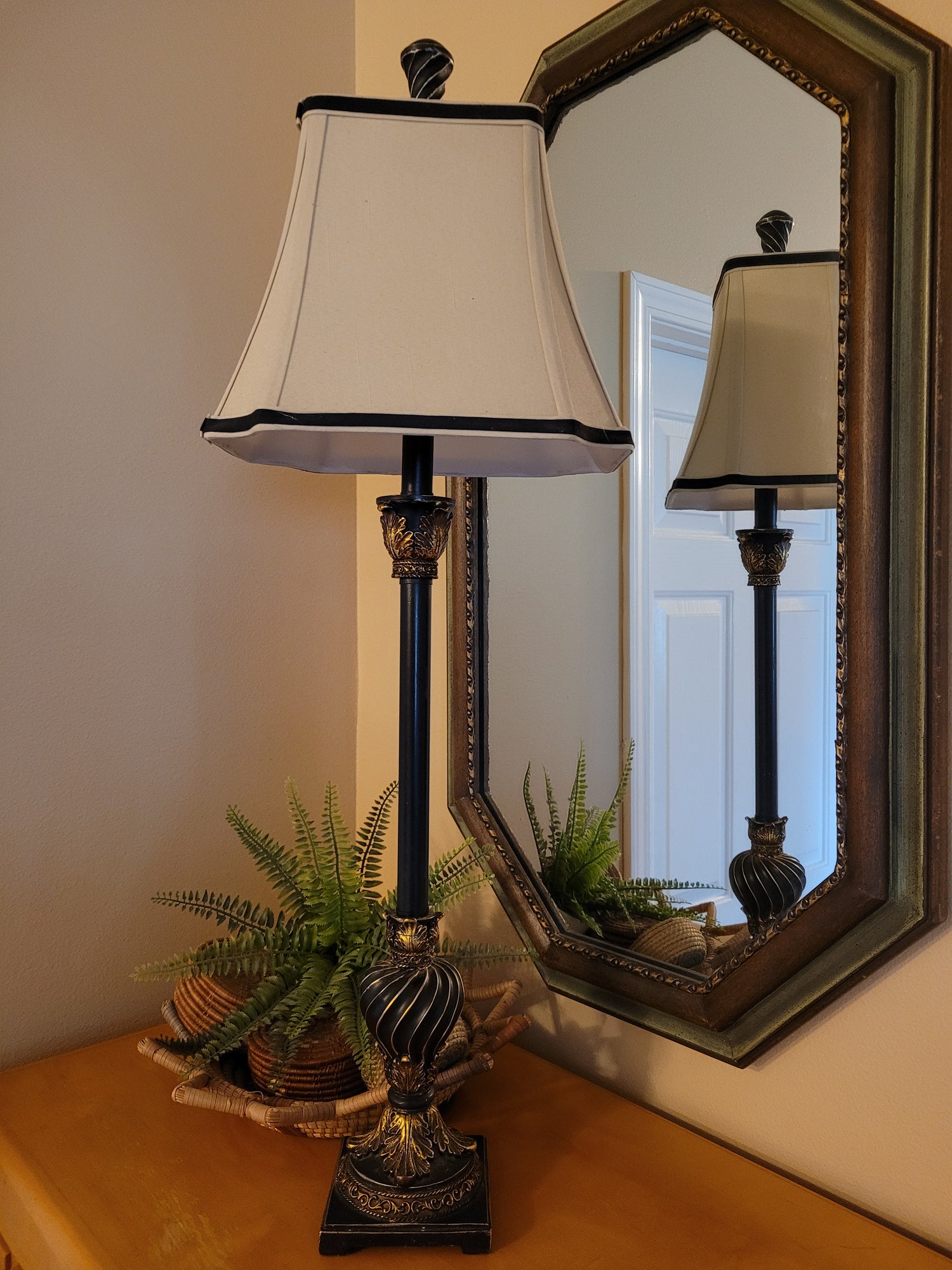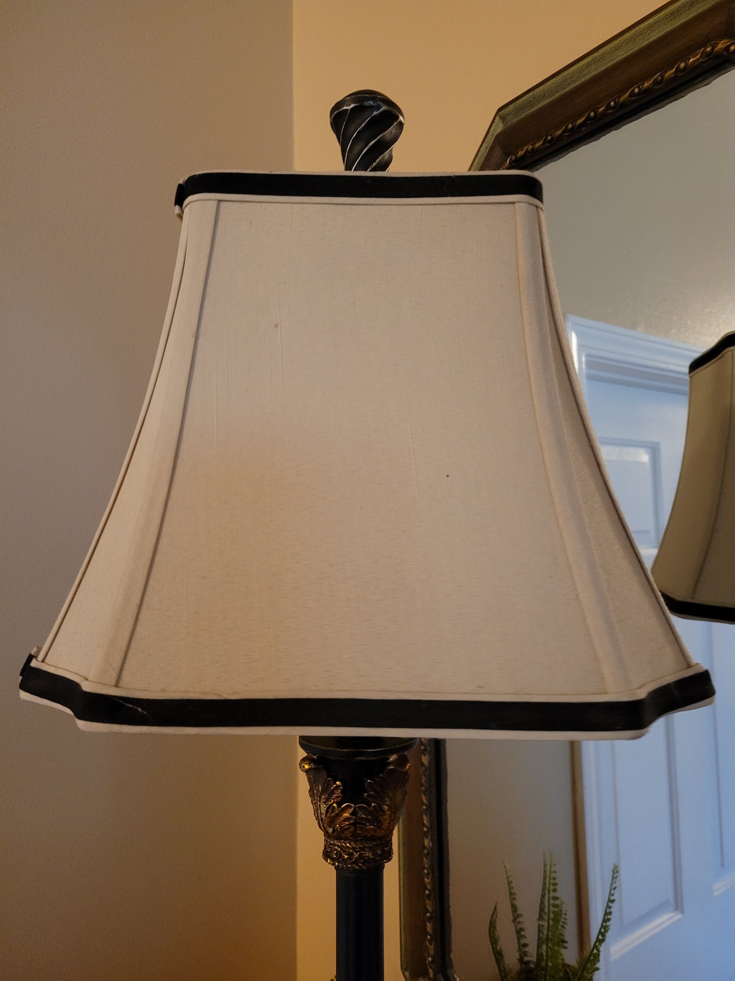 Vintage Candlestick Lamp finished in black features gilding. Shade features black details. Lamp measures 4½ x 32 inches. Shade measures 11 x 8½ inches.