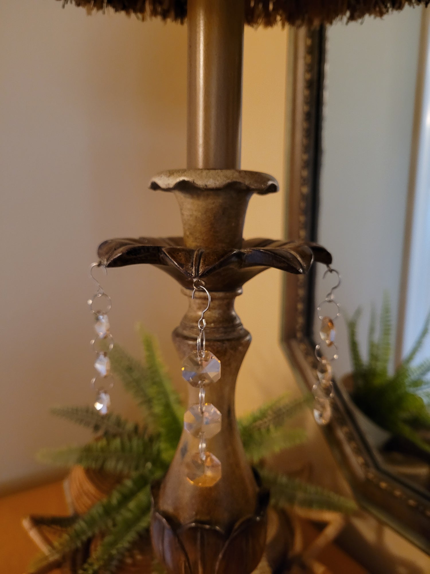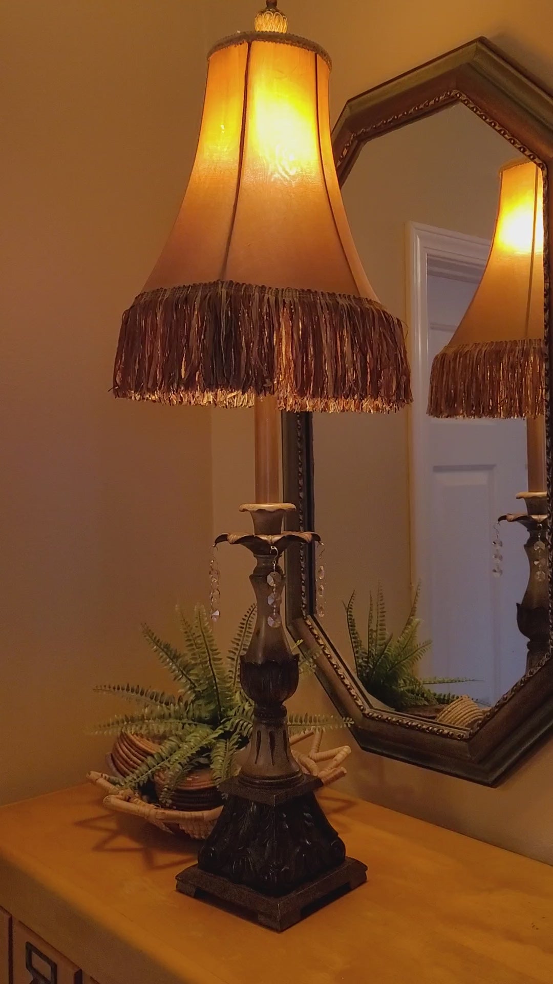 Stunning vintage console lamp with fringed shade and beaded details. Lamp measures 5¾ x 36½ inches. Shade measures 10½ x 11 inches.