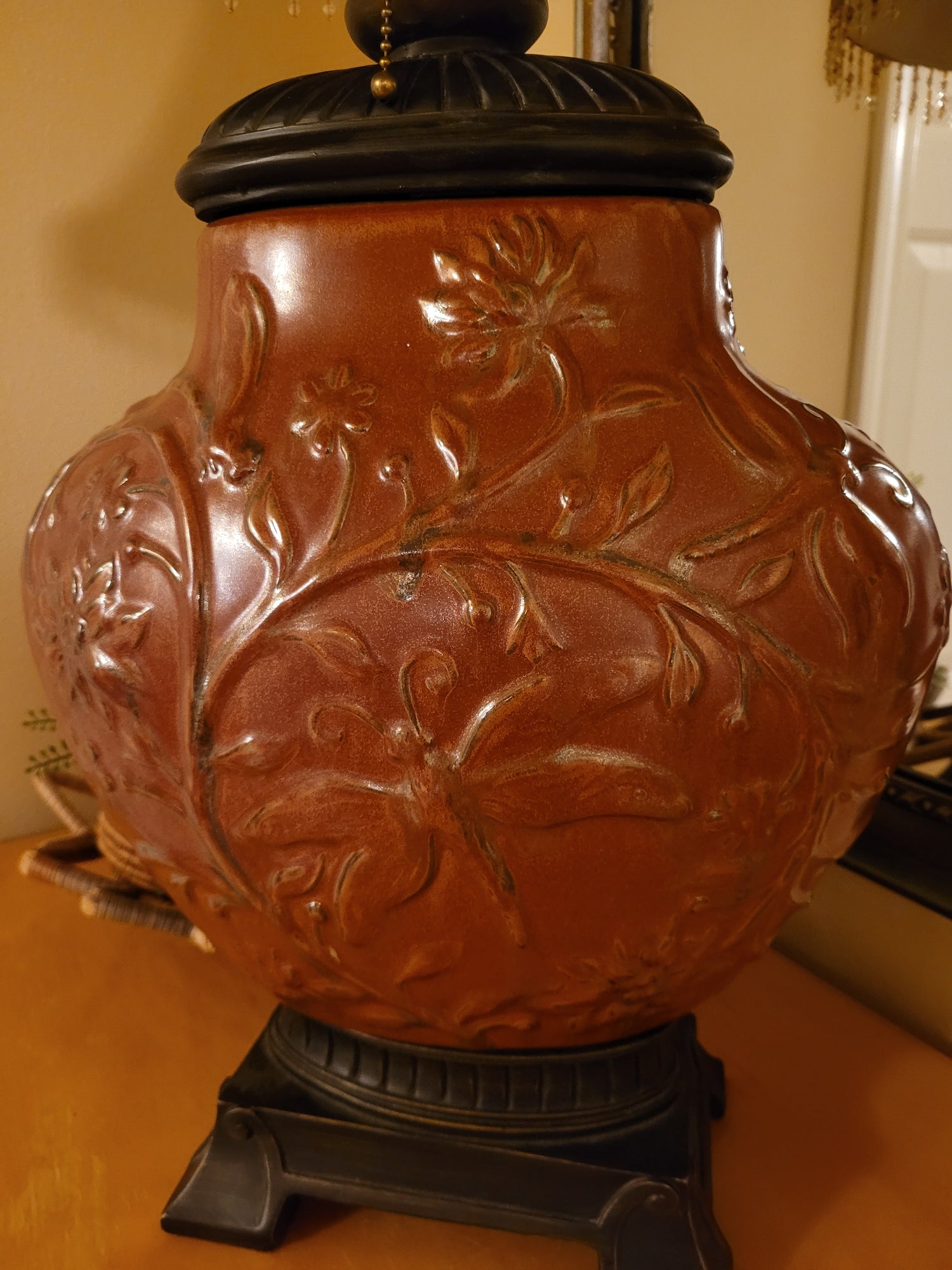 Stunning vintage table lamp with embossed ceramic base and beaded shade. Pull chain switch. Lamp measures 12" w x 6" d x 30" h. Shade measures 14" w x 9½" h.