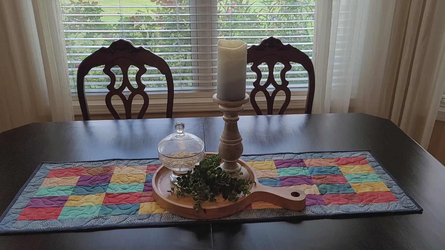 Handmade patchwork furniture scarf with rectangle pattern features batik fabrics. Perfect for use on a dining table, dresser, coffee table, or cabinet top. Machine washable. Proudly handmade in the USA. Measures 13 1/2 inches wide by 42 inches long.
