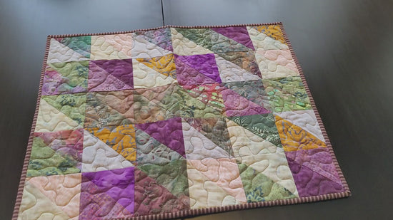 Handmade table topper featuring batik fabrics. Perfect for use on a dining table, dresser, coffee table, or cabinet top. Machine washable. Proudly handmade in the USA. Measures 16 inches wide by 19 inches long.