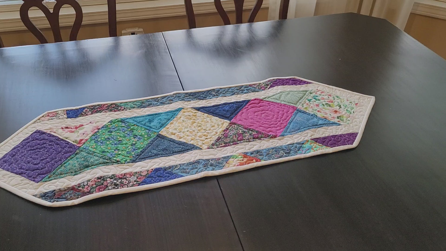 Handmade table runner with stunning rose themed quilting. Perfect for use on a dining table, dresser, coffee table, or cabinet top. Machine washable. Proudly handmade in the USA. Measures 11 1/2 inches wide by 36 inches long.