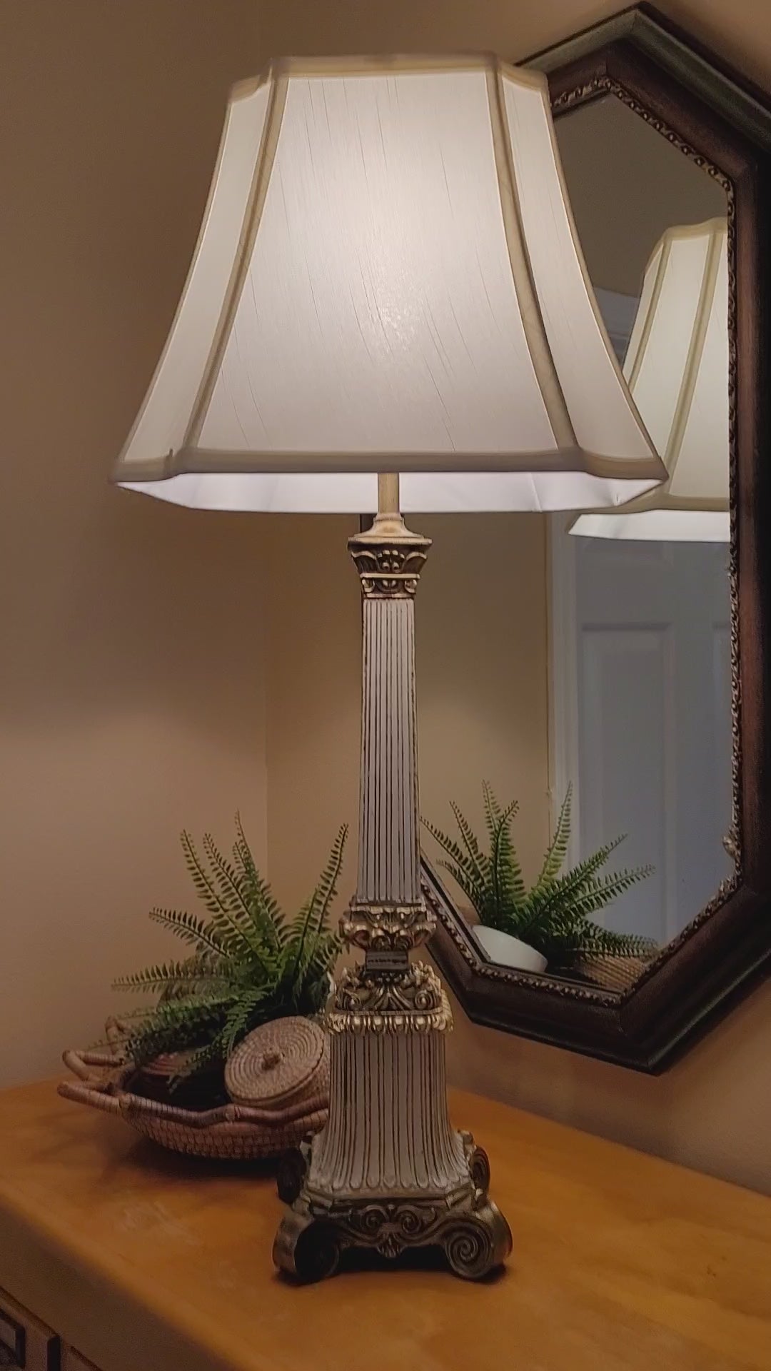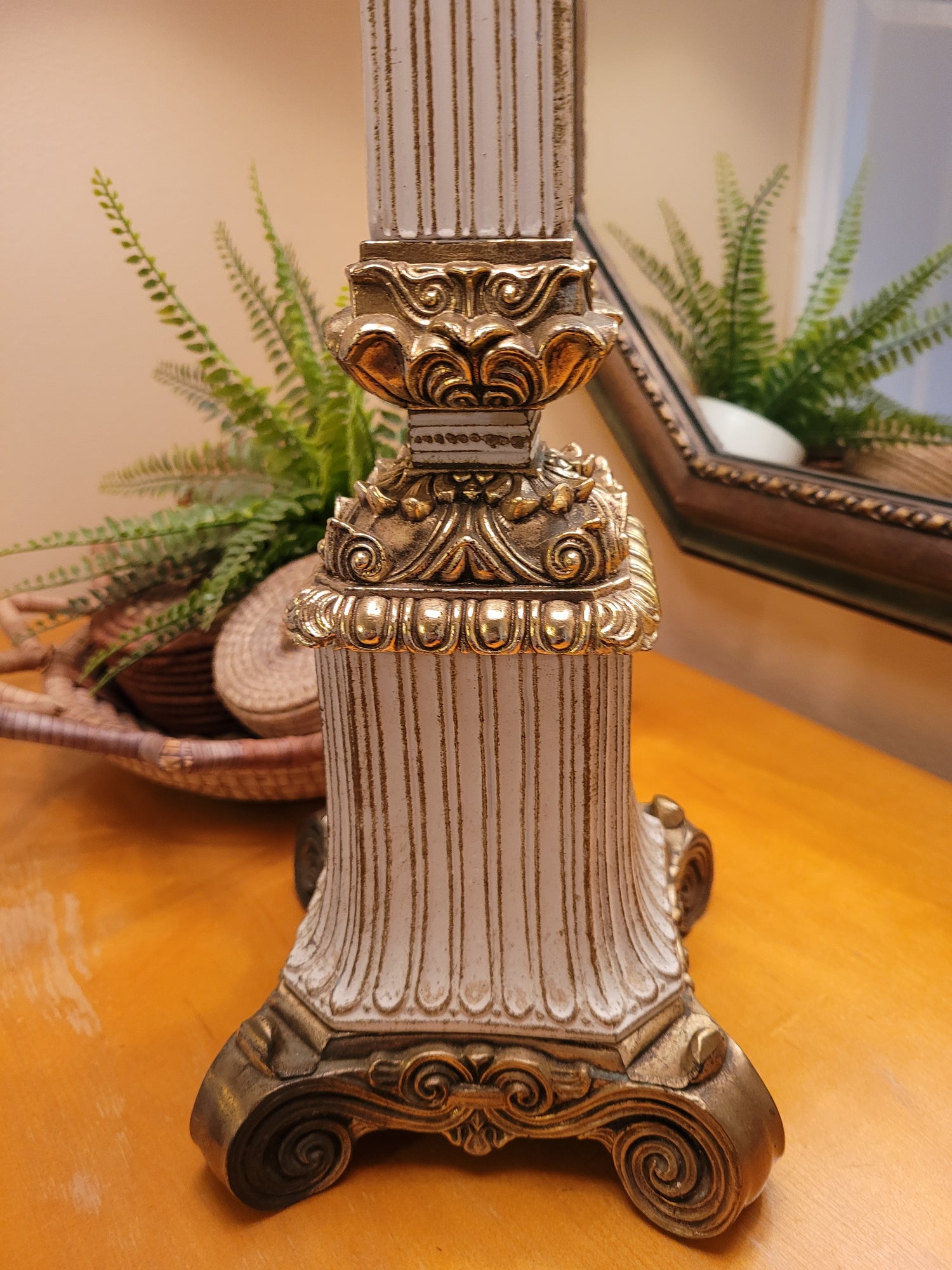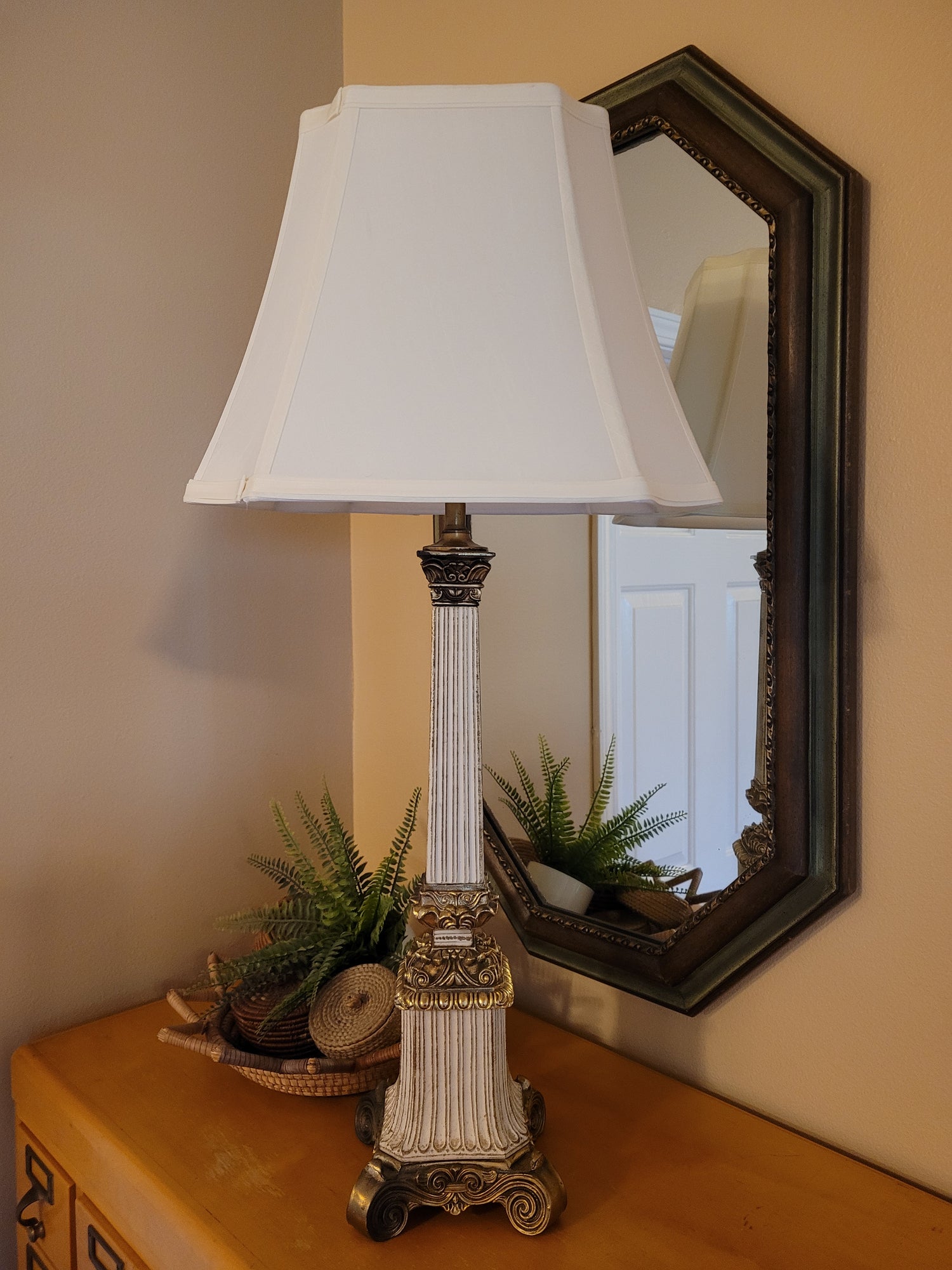 Gorgeous vintage brass pillar lamp with white detailing. Three way switch. Lamp measures 7 inches wide by 31 inches high. Shade measures 14 inches wide by 11 inches high.