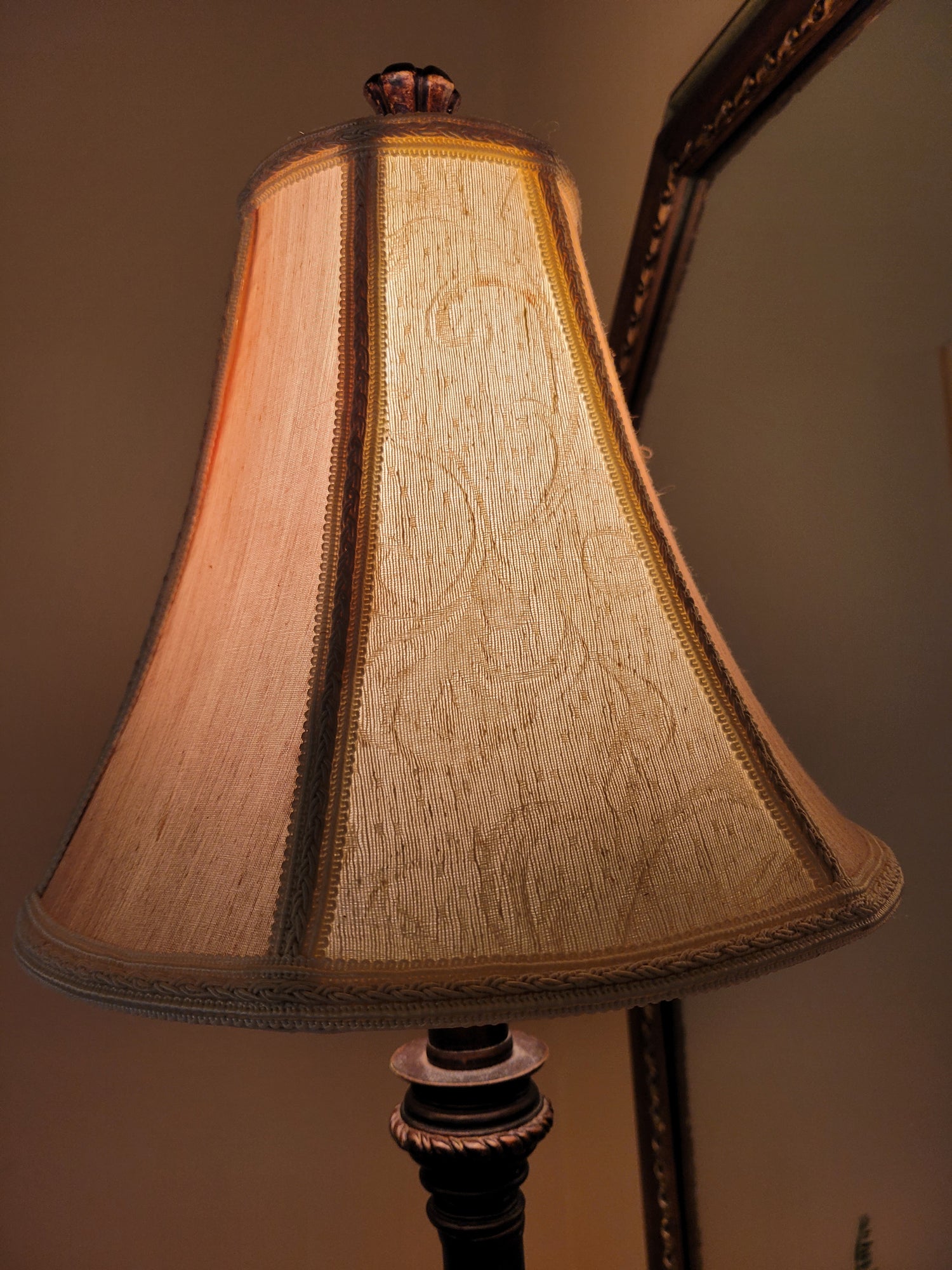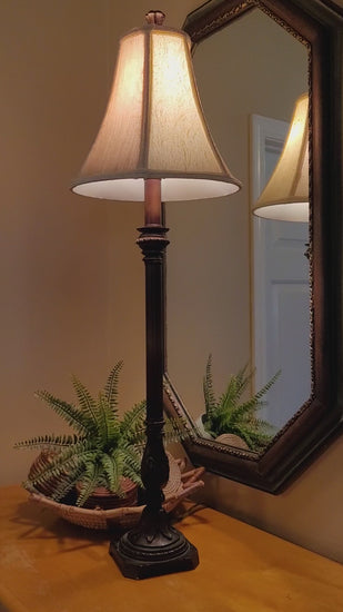 Lovely vintage candlestick lamp measures 4 1/2 inches wide by 32 inches high. Shade measures 10 inches wide by 8 1/2 inches high.