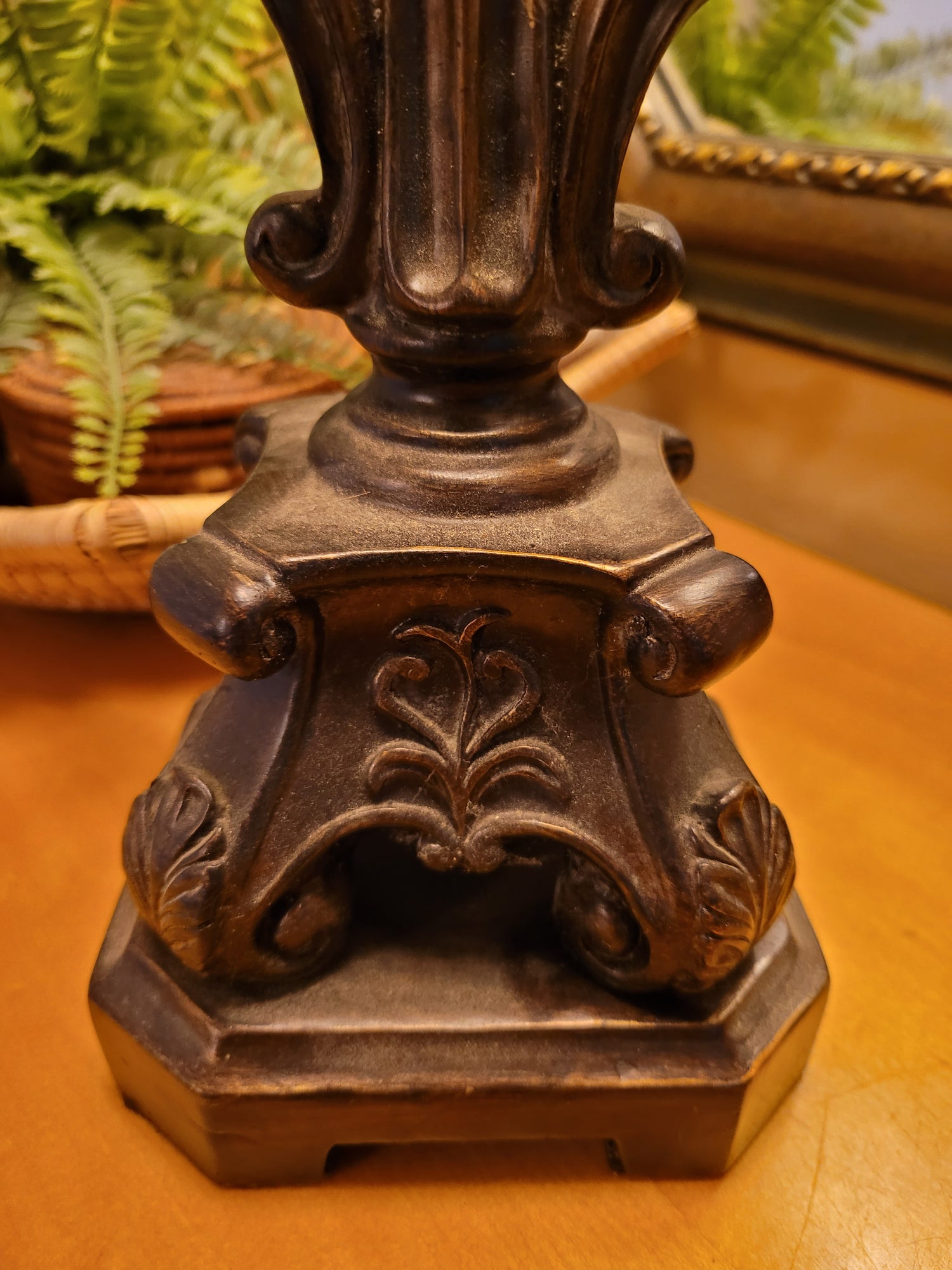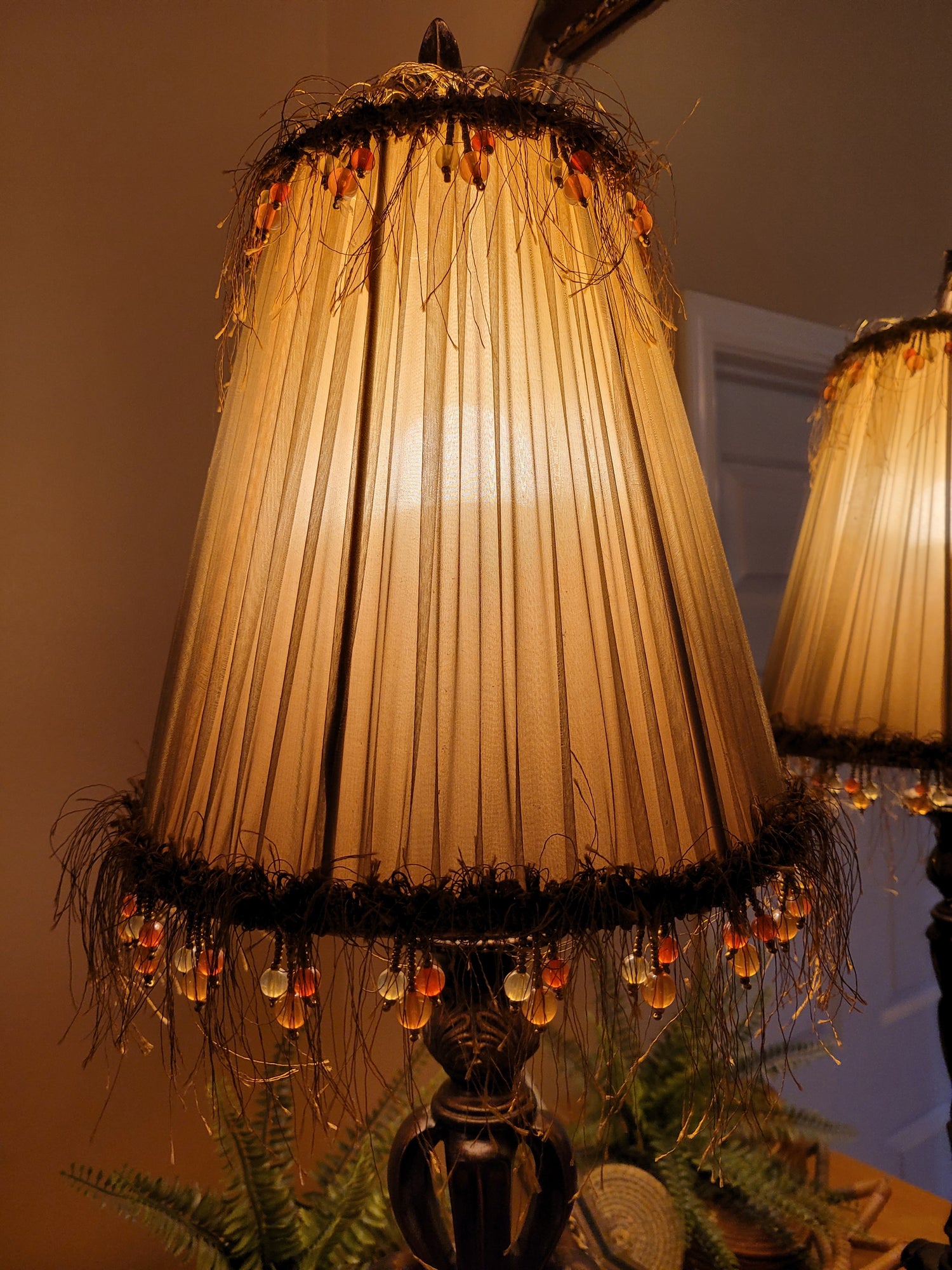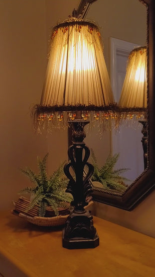 Gorgeous vintage candlestick lamp features a fringed and beaded shade. Unique details. Lamp measures 5 inches wide by 30 inches high. Shade measures 10 inches wide by 10 1/2 inches high.