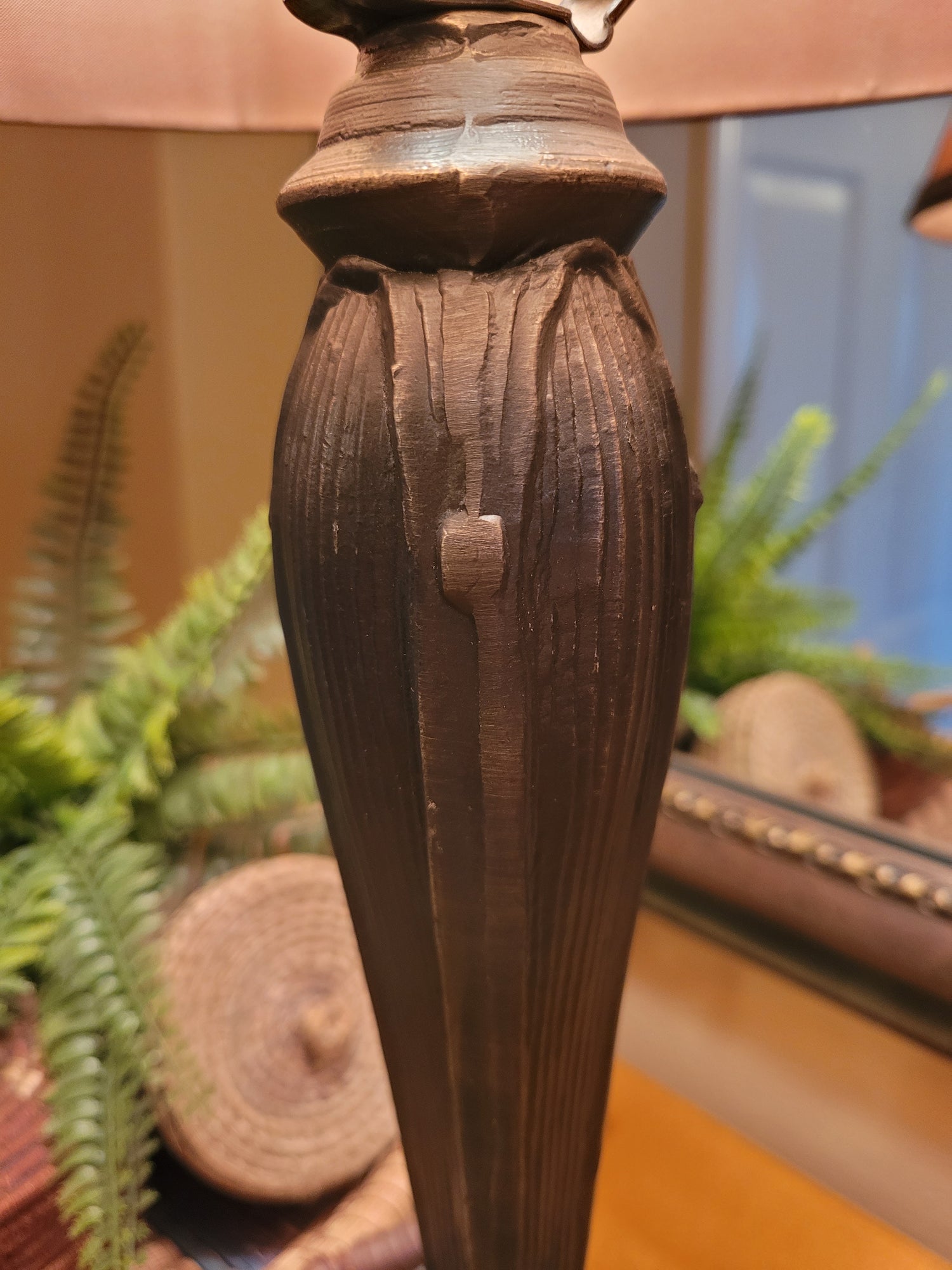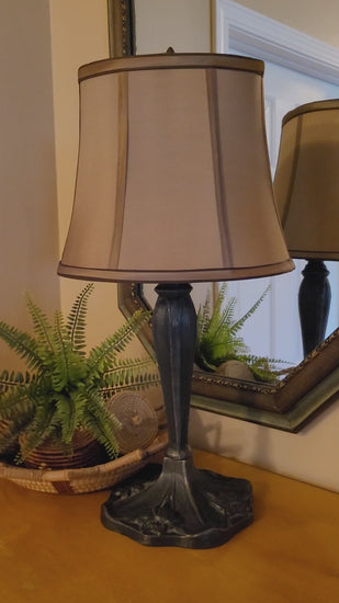 Vintage pedestal lamp with embossed metal base. Lamp measures 8 wide inches by 21 1/2 inches high. Shade measures 11 inches wide by 8 inches deep by 9 inches high.