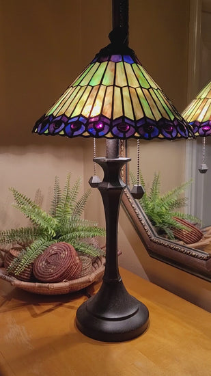 Beautiful stained glass lamp with 2 lights. Pull chain switches. Lamp measures 6" w x 22½" h. Shade measures 5½" h X 12" w.